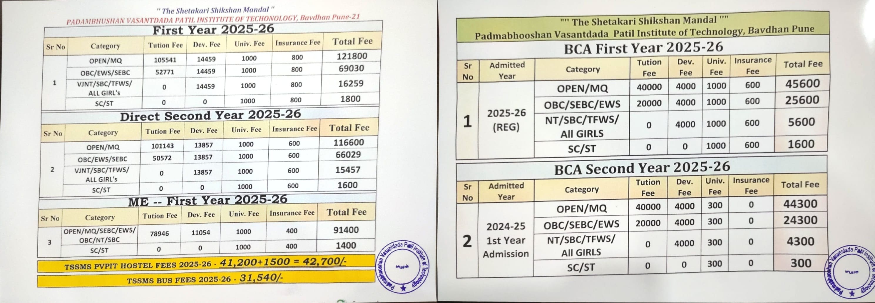Updated College Fees for AY 2025-26 for First year, Direct second year, ME & BCA